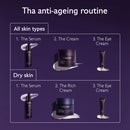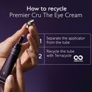 Image 1 - A hand applies Caudalie Premier Cru The Eye Cream from a purple tube with a silver applicator to the skin below a persons eye, with text 84% saw a smoother and brighter-looking eye contour*, Premier Cru La Crème Yeux The Eye Cream, CAUDALIE PARIS, and *Clinical study, % of satisfaction, 32 volunteers, 56 days. Image 2 - A before and after comparison shows a persons eyes, with the top image labelled Before showing wrinkles around the eyes and a blemish on the forehead, and the bottom image labelled After 56 days showing fewer wrinkles and no blemish, with text below stating 88% crows feet wrinkles reduced* and *Clinical study, 32 volunteers, 56 days. Image 3 - A smiling woman with visible laugh lines and an earring holds a purple Caudalie Premier Cru La Crème Yeux Cream tube, with a dab of cream under her eye, and overlaid text reads Targets all signs of ageing, Wrinkles, Dark spots, Volume. Image 4 - The image features a dark purple background with the title Ingredients, followed by three sections describing product components: the first shows dark grape-like shapes with bubbles and the text Longevity patent, Stimulates youth proteins; the second displays swatches of white cream with Natural plumping filler, Improves skin volume; and the third presents a mother-of-pearl texture with Blend of pearlisers, Instantly illuminates. Image 5 - The image presents Tha anti-ageing routine, detailing products for All skin types: 1. The Serum (Caudalie Paris Premier Cru Le Serum The Serum), 2. The Cream (Caudalie Paris Premier Cru La Crème The Cream), and 3. The Eye Cream (Caudalie Paris Premier Cru La Crème Yeux The Eye Cream); and for Dry skin: 1. The Serum (Caudalie Paris Premier Cru Le Serum The Serum), 2. The Rich Cream (Caudalie Paris Premier Cru La Crème Riche The Rich Cream), and 3. The Eye Cream (Caudalie Paris Premier Cru La Crème Yeux The Eye Cream). Image 6 - A close-up of green grapes on a vine with sunlight highlighting them, accompanied by text that reads Powered by the grape, Patented, highly effective, natural formulas, 0% Parabens, phenoxyethanol, mineral oils, PEG, silicones, sodium laureth sulfate, animal ingredients, vegan, 1% FOR THE PLANET, and 100% OCEAN PLASTIC COLLECT. Image 7 - A persons hands demonstrate how to recycle a dark purple Caudalie Premier Cru The Eye Cream tube, showing the silver applicator being separated from the tube which is labeled Caudalie Paris La Crème Yeux The Eye Cream, with visible instructions reading How to recycle Premier Cru The Eye Cream, followed by 1 Separate the applicator from the tube, and 2 Recycle the tube with Terracycle, featuring the Terracycle logo.